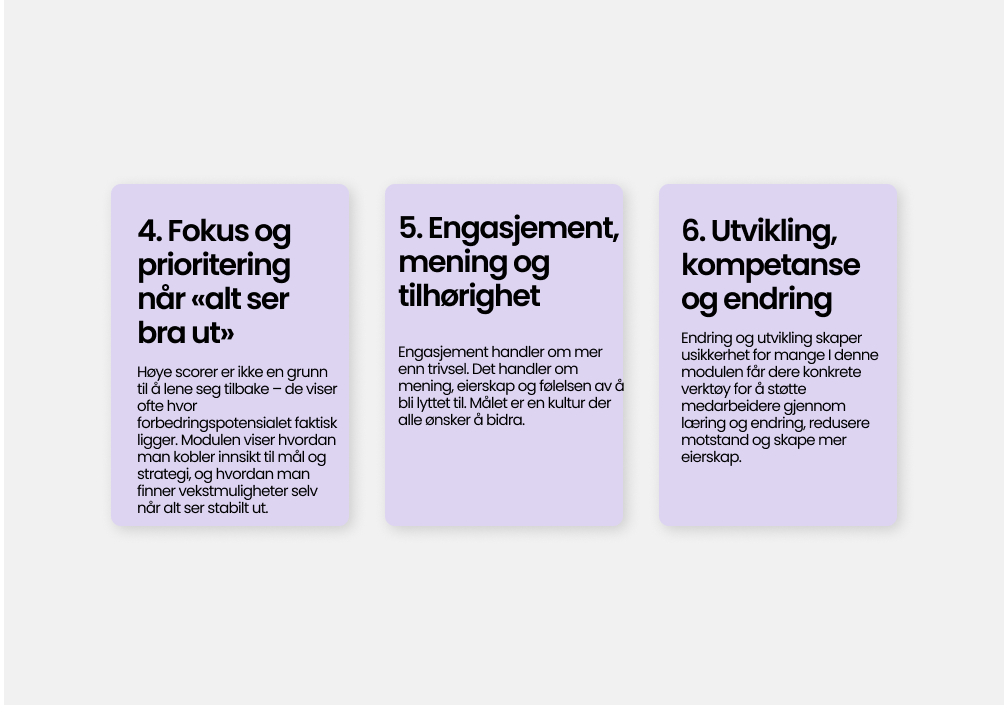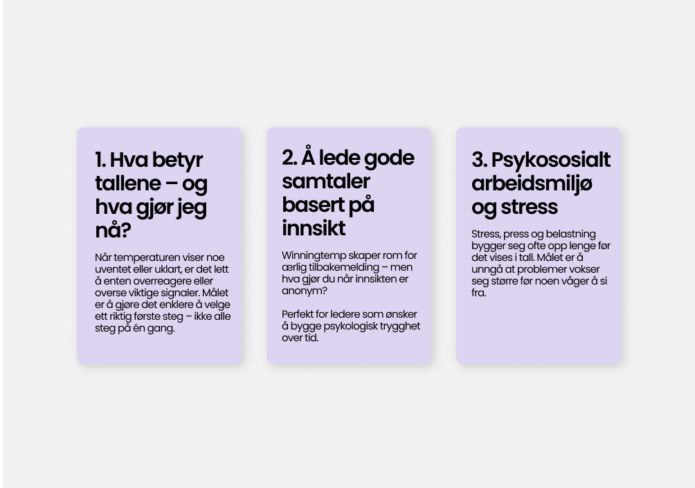 Korte, kraftfulle læringsvideoer fra Bård Brænde – direkte integrert i Winningtemp. Learning er en inspirerende tilleggsmodul utviklet for å hjelpe ledere og medarbeidere med å gjøre innsikten fra temperaturene om til konkrete, meningsfulle handlinger. I stedet for at tallene bare blir tall, får dere støtte til å forstå hva de faktisk betyr, hvordan de skal tolkes – og hvordan dere kan bruke dem til å skape en bedre arbeidsplass sammen.